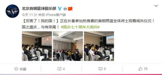 除此之外,广东男篮、北京男篮等队都组织全队观看了阅兵仪式,广东男篮主教练杜锋在观看阅兵仪式后表示:“震撼,感动,伟大祖国母亲万岁。”