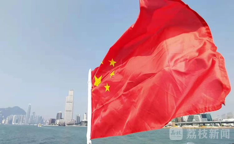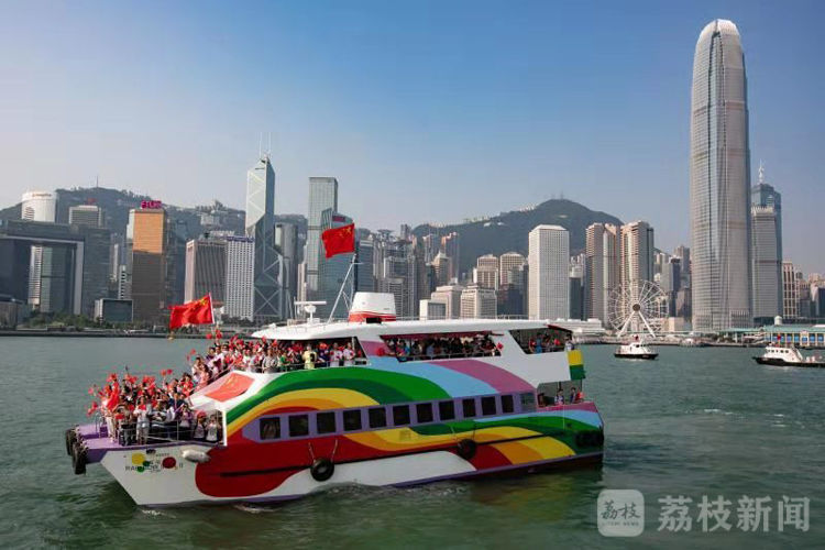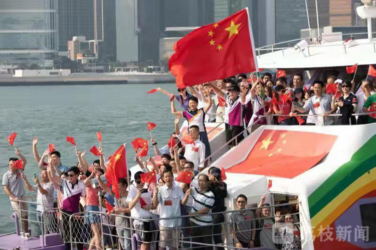 游船经过维港,在湾仔金紫荆广场外的海上扬起国旗,市民高唱国歌和《歌唱祖国》等歌曲,欢呼声响彻维港两岸。