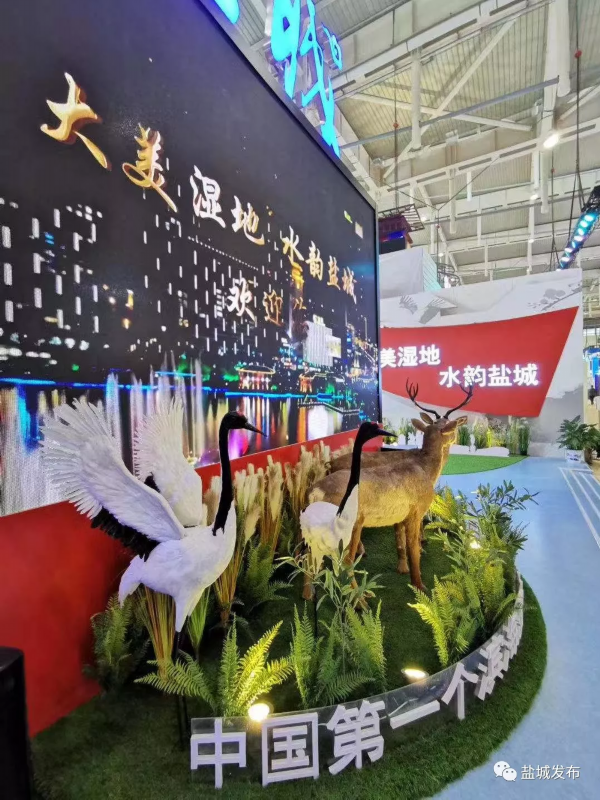 盐城馆的入口处,迎宾的是芦苇丛中栩栩如生的两对麋鹿和丹顶鹤的塑像,背景音乐里有鹤鸣九皋和潺潺流水声。同时,新近入选摄影国展的摄影家孙华金等人的多媒体摄影作品《湿地家园、自然遗产》也在此次成就展中予以展示,让观展市民对盐城获得的世遗“金色名片”一见倾心。