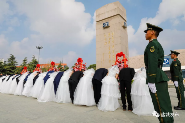 金秋的盐阜大地,天高云淡,叶叶落晖。国民革命军新编第四军重建军部纪念碑在苍松翠柏的掩映下,显得庄严肃穆。临近9时,戴源、曹路宝、李驰、陈红红、张礼祥、王荣、王小红、吴晓丹、柏长岭、羊维达、崔浩、倪峰等市领导和盐城军分区领导常新生、李泽勇来到新四军纪念馆广场,和烈士亲属、新婚夫妇、机关干部、现役官兵、小学生以及在校大学生等社会各界代表怀着无比崇敬的心情,缓步走到纪念碑前,静默肃立。