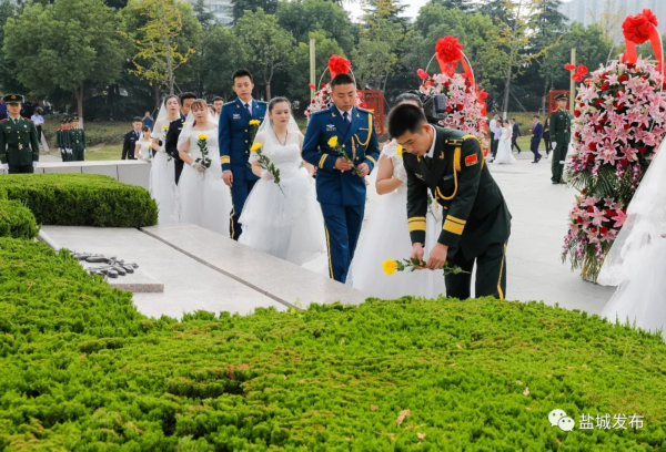 伴随着深情的《献花曲》,向纪念碑敬献花篮开始。10名礼兵托起由中共盐城市委、市人大常委会、市政府、市政协和盐城军分区分别敬献的5个花篮,缓缓走向纪念碑,将花篮摆放到纪念碑基座上,花篮红色缎带上写着“革命烈士永垂不朽”8个金色大字。鲜花尽情绽放,松柏淡淡芬芳,寄托着新时代盐阜儿女对革命烈士的永远缅怀和崇高敬仰。整理缎带毕,35对新婚夫妇代表向烈士纪念碑敬献鲜花。