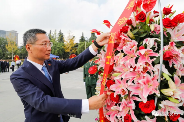 市委书记戴源、市长曹路宝、市政协主席李驰、市委副书记陈红红等,同盐城市社会各界近千名代表来到这里,举行敬献花篮仪式,深切缅怀革命先烈的丰功伟绩,传承弘扬革命烈士的铁军精神,不忘初心、牢记使命,锐意进取、担当作为,凝聚全面建成小康社会的磅礴力量。