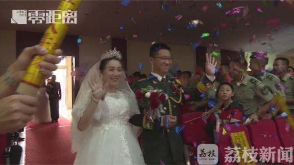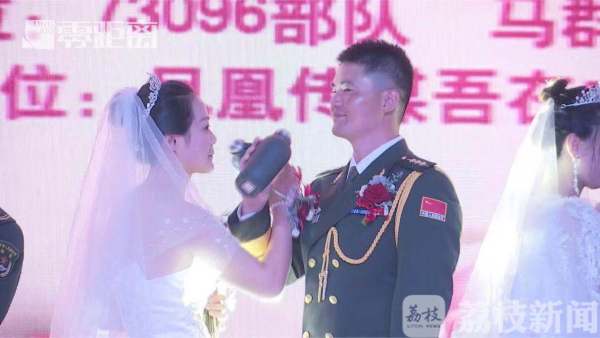 水壶喝交杯,钢盔装喜糖,这些环节充满了军旅特色,台上的新郎新娘笑得开心,观看婚礼的官兵们也不停叫好。对于这19对新人来说,部队礼堂中的集体婚礼,也让祖国见证了他们美满的爱情。