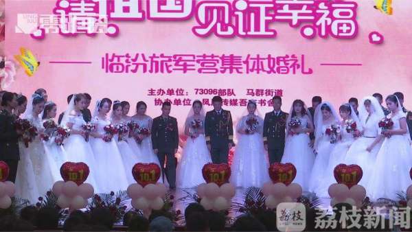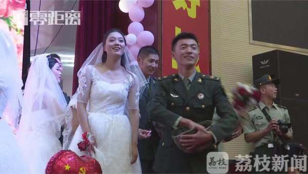 荔枝新闻讯 在今天上午临汾旅驻地的升旗仪式中,19名临汾旅官兵挽着各自的恋人,一起参加了仪式。在升旗仪式结束后,这19对新人,也在临汾旅会堂内,举办了一场特别的集体婚礼。