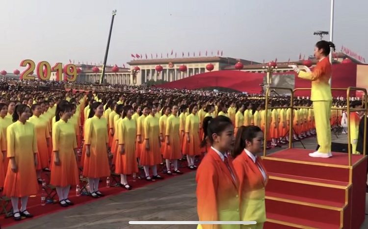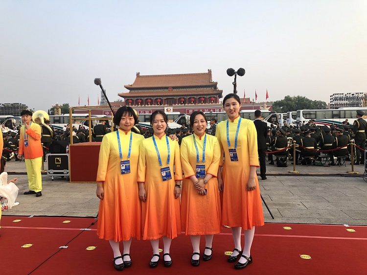10月1日上午,在国庆70周年庆典上,一个颜色绚烂的“方阵”吸引了众人的注意。他们身穿黄橙晕染的服装,高声献歌,像一片朝霞在天安门广场上绽放。