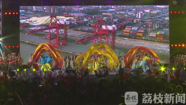 在万众欢腾的长江之滨绿茵广场,历史悠久的南通民间歌舞《跳马伕》点燃了全场的热情,那一支支如痴如醉的欢歌劲舞,带给现场观众的是激情豪迈和雄浑刚健。12个500人方阵演员与台下观众热情的互动、不断舞动的红旗让活动高潮迭起。