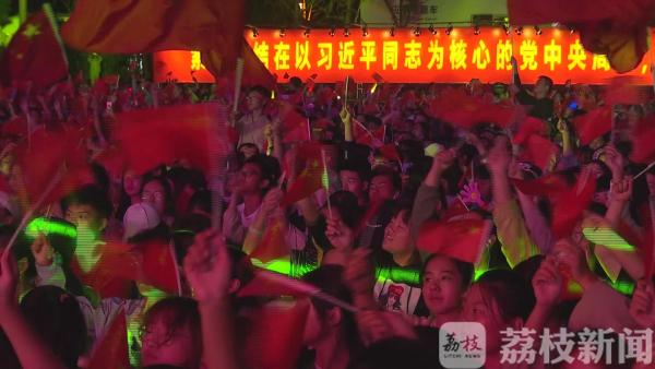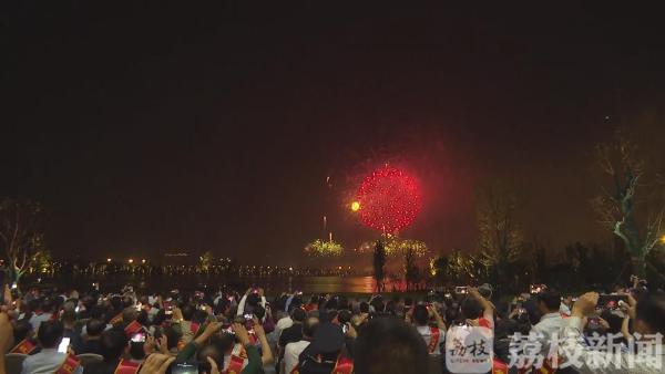 晚上九点,数以万计的市民来到了紫琅湖公园,一同欣赏大型焰火晚会。本次焰火燃放的造型融入了庆祝新中国成立70周年的形象和寓意,用焰火摆出了“70”、“祖国万岁”等造型。