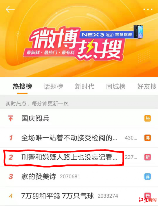 10月1日上午,新中国成立70周年阅兵,在网上传出四川省巴中市多名民警和一“C位”犯罪嫌疑人在火车上一同观看阅兵仪式的图片在网上火了,进入微博热搜。