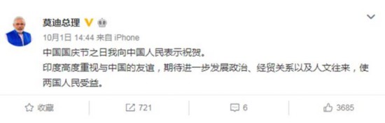 10月1日下午,莫迪用中文发微博,“中国国庆节之日我向中国人民表示祝贺。”