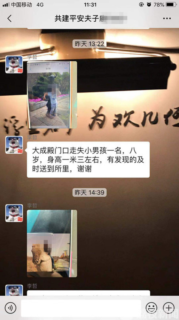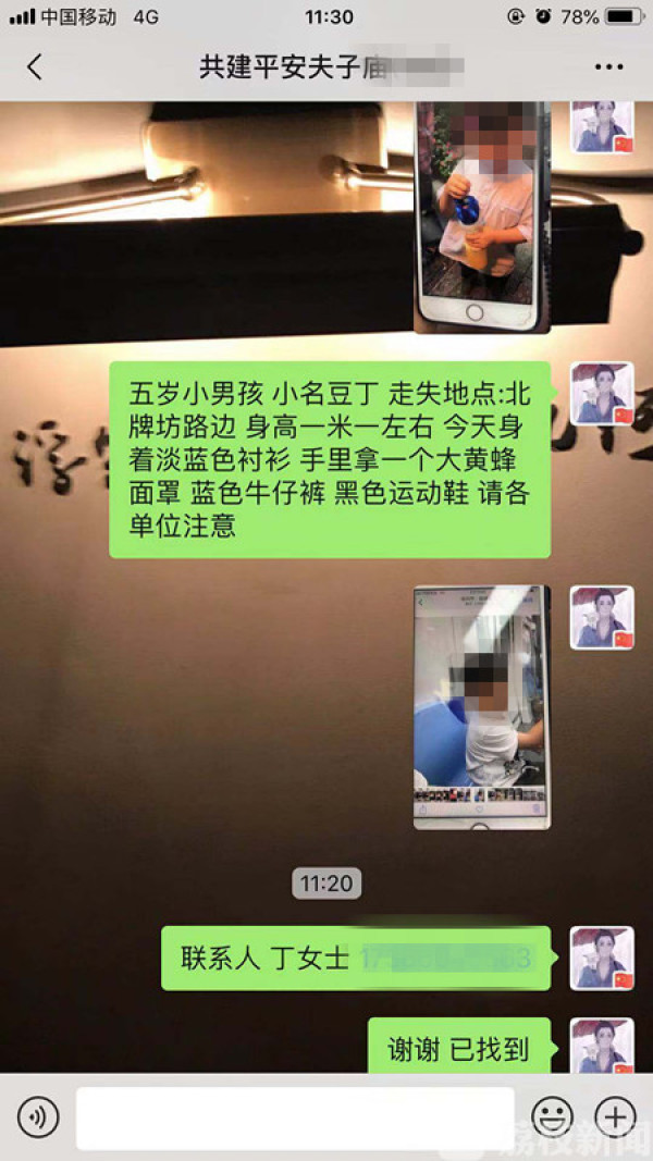 在丁女士报警的时候,民警将小豆丁的信息和照片发到微信群里。这个共建平安夫子庙的微信群,是夫子庙派出所创办的,里面包括夫子庙管委会的工作人员,沿街店铺的工作人员,甚至是路面的环卫工人都在这个群里,一旦发现有老人、小孩走失,物品丢失的信息,他们也在路面上随时可以留意,便于及时寻找。有时候在人流密集的地方,几米范围内可能就能找到走失的孩子,极大提高了警方的救助效率。昨天,夫子庙地区就救助了10个走失的孩子,全部及时送到了家长的手中。