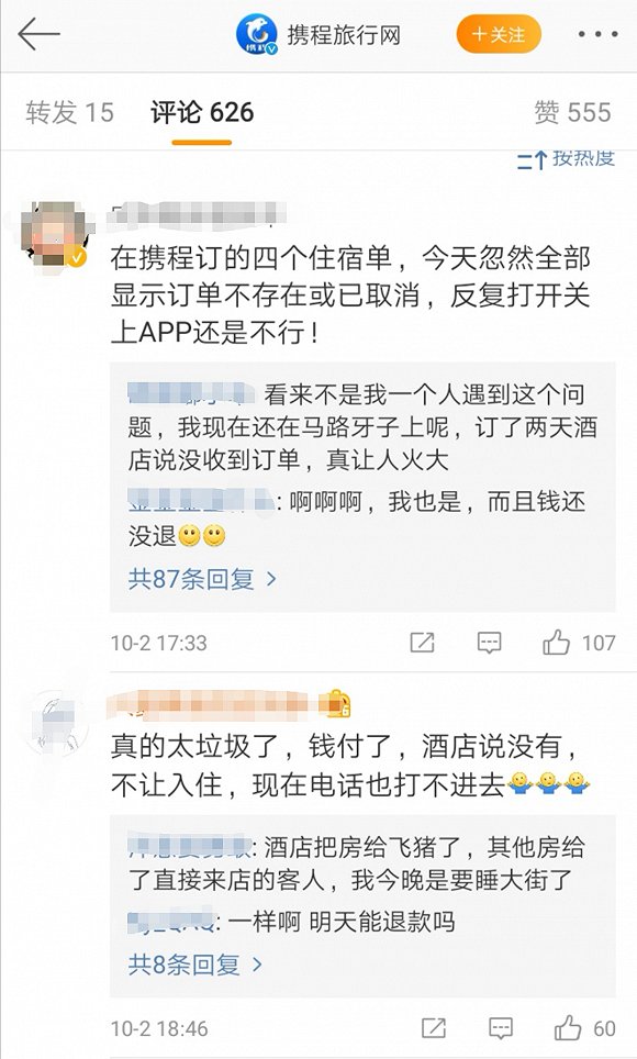 10月2日晚八点半左右,微博大量网友爆料称,正值国庆出行高峰,自己在携程平台预定支付的酒店订单已经扣款,但订单无法确认,携程客服打不通,影响到出行安排。