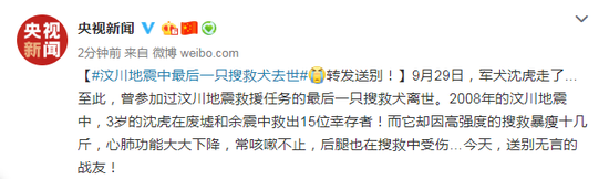 9月29日,军犬沈虎走了…至此,曾参加过汶川地震救援任务的最后一只搜救犬离世。2008年的汶川地震中,3岁的沈虎在废墟和余震中救出15位幸存者!而它却因高强度的搜救暴瘦十几斤,心肺功能大大下降,常咳嗽不止,后腿也在搜救中受伤…今天,送别无言的战友!