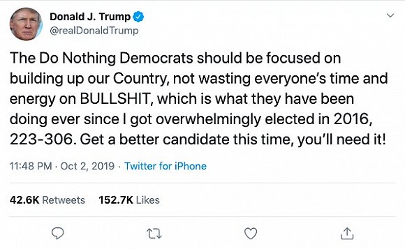 特朗普在推特上写道:“什么都没做的民主党人要集中建设我们的国家,而不是浪费所有的时间和精力在这里扯淡,从2016年我在大选中获得压倒性胜利时他们就这样。”