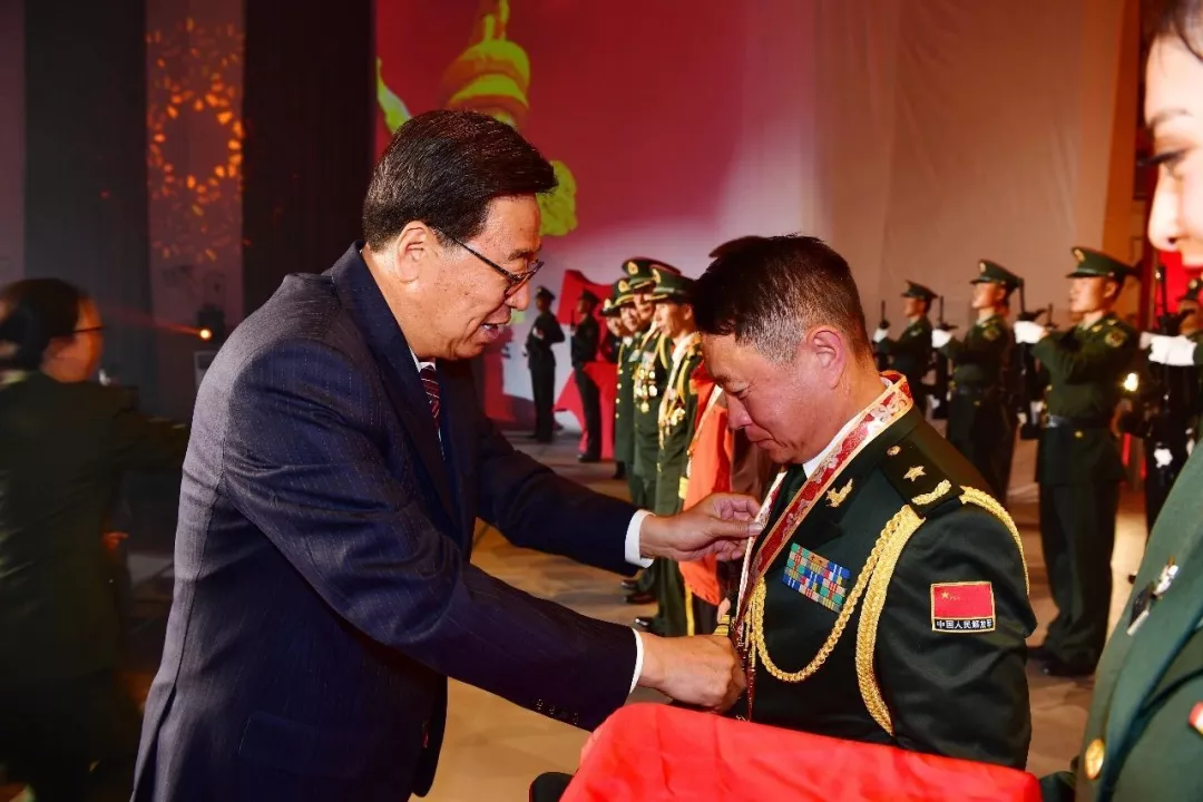吴英杰等为受到表彰的西藏军区部队官兵代表或家属颁发“庆祝中华人民共和国成立70周年”纪念章。