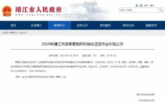 近日,靖江市政府官网上公布了一份2019年靖江市夏季麦秸秆机械化还田作业补贴公示。