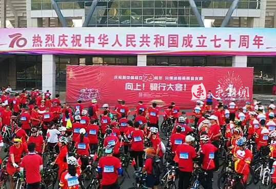 2019年10月3日上午,沭阳县400余名自行车骑行爱好者,在西郊森林公园参加全县的自行车骑行大赛,欢庆新中国成立七十周年。本次大赛以爱国为主题,倡导低碳环保、绿色健康的生活,最大者年龄为67岁,最小者年龄为13岁。