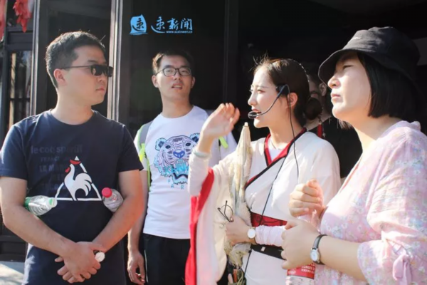 10月3日下午,化着淡妆,带着耳麦,身着楚服的王周冰向游客们如数家珍地讲解西楚文化。虽然王周冰每天都是在重复着同样的工作,但针对不同的团体,她也会因人而异。“像小朋友居多的旅行团,就会在兵器、马车、冰雪奇缘体验区多停留,加上一些生动的故事。像老年人居多的团体就倾向于多讲宿迁的历史和西楚文化。”