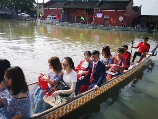 就在当天,冠英村一对新人要举办婚礼,新郎直接坐着龙舟接新娘,这段视频在朋友圈炸开了锅。这种特别的迎亲方式,这对新人恐怕要记一辈子。