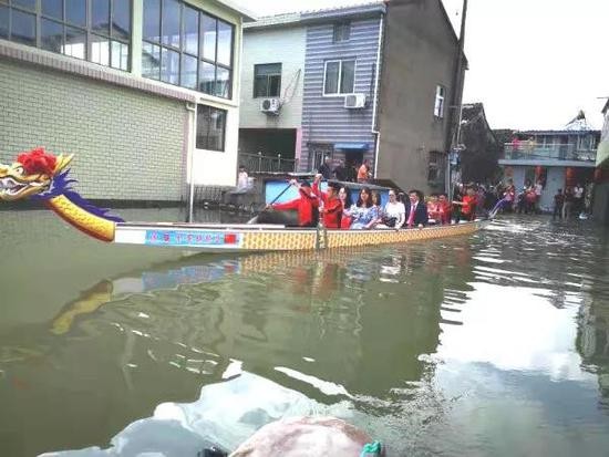 “一场台风,龙舟里全是水,前前后后做准备工作就花了三四个小时。9:50分左右,新郎来接人了,刚好赶上,没耽误。”