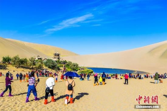 国庆长假期间,国际旅游名城甘肃敦煌著名景区鸣沙山月牙泉旅游迎来“高峰模式”。据统计,10月3日,该景区接待中外游客达到3万人次,掀起金秋敦煌旅游新高潮。王斌银 摄