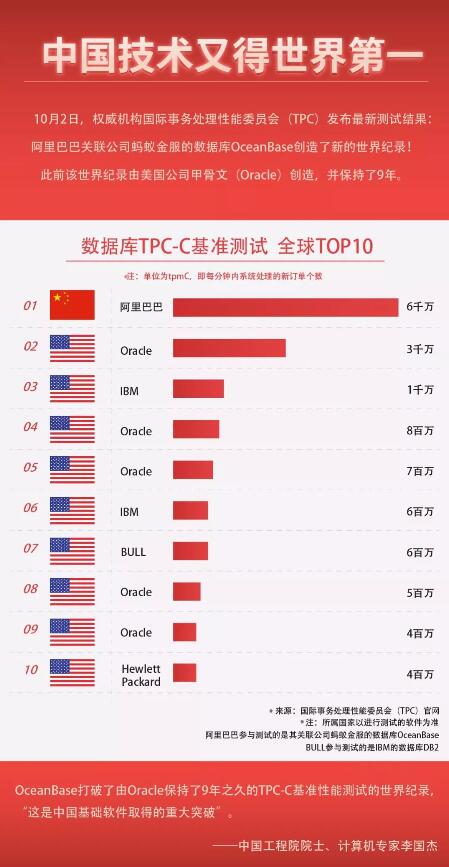 蚂蚁金服自主研发的数据库OceanBase打破数据库基准性能测试的世界记录,成绩是前世界记录保持者、老牌巨头甲骨文(Oracle)的两倍。数据库领域最权威的国际机构国际事务处理性能委员会(TPC,Transaction Processing Performance Council)在官网发表了这一最新结果。
