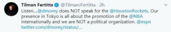 NBA休斯顿火箭队老板蒂尔曼-费尔蒂塔,今日在个人社交媒体发布了一条动态,他写道:“听着....@莫雷的言论不代表休斯顿火箭。我们在东京的存在完全是为了在国际上推广NBA,我们不是一个政治组织。”