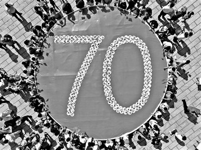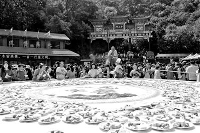 景区工作人员把盛有食物的盘子摆出“70”图案