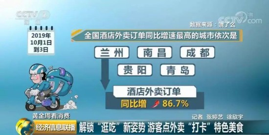 据某在线外卖平台的数据显示,今年10月1日到3日,全国酒店外卖订单同比增速最高的城市依次是兰州、南昌、成都、贵阳、青岛,其中,兰州的酒店外卖订单同比增长高达86.7%。