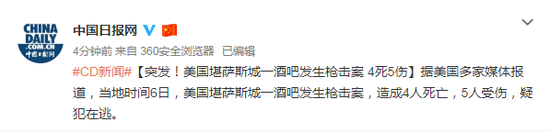 据美国多家媒体报道,当地时间6日,美国堪萨斯城一酒吧发生枪击案,造成4人死亡,5人受伤,疑犯在逃。