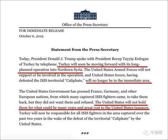 今天,特朗普总统与土耳其总统埃尔多安通了电话。土耳其将很快推进准备已久的行动,出兵叙利亚北部。美国军队既不支持也不卷入这一行动,美国军队在挫败“伊斯兰国”后,也将不继续留在这一地区。