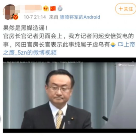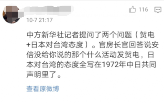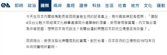 一段在大陆微博上流传的记者会上的视频,也显示冈田做出了上述表态,我们《环球时报》的记者也核实了视频的内容,证实冈田确实表示安倍并没有发出贺电,同时日本政府对台湾的立场是基于1972年签署的《中日联合声明》。