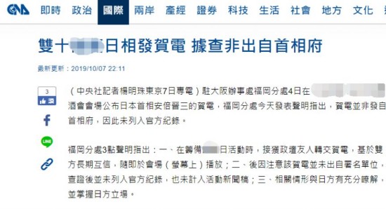 但与这一扭扭捏捏的姿态行程鲜明对比的是,“台北驻大阪经济文化办事处福冈分处”几天前还大张旗鼓地宣称安倍晋三给台湾发来“祝福中华民国108年”贺电,并纵容台湾媒体在报道中炒作此事,与如今该处宣称“没有计入活动新闻稿”存在明显的矛盾。