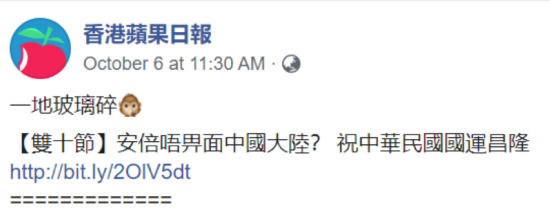 最后,在昨天日方做出这番澄清后,仅有中央社等少数台湾媒体报道了此事。在台湾煽动“台独”、在香港煽动“港独”的《苹果日报》等“毒媒”目前则并未提及此事,仍然在宣称安倍发了贺电,并意淫大陆“玻璃心碎”……