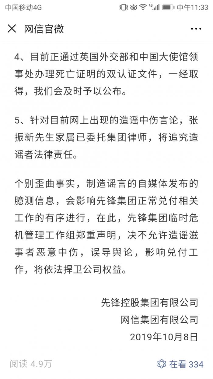 9月底,有消息称,先锋集团董事长张振新失联。10月5日,网信官微公号发布讣告称,先锋集团董事长、网信集团实际控制人张振新先生因多脏器衰竭、酒精依赖、急性胰腺炎经抢救无效,于伦敦时间2019年9月18日在英国伦敦切尔西和威斯敏斯特医院去世,享年48周岁。