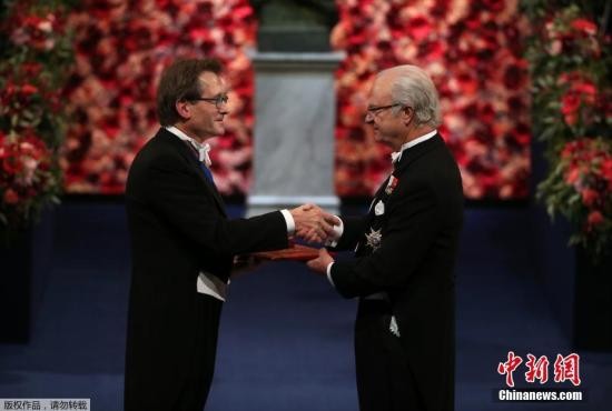 资料图:2016年12月10日,诺贝尔颁奖仪式在瑞典首都斯德哥尔摩举行,图为瑞典国王卡尔十六世·古斯塔夫(右)为诺贝尔化学奖获得者之一伯纳德·费林加颁奖。