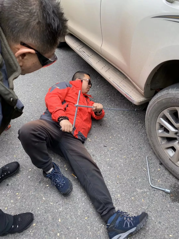 自驾路上汽车出现故障,江苏广播电台主持人、嘀嘀叭叭国际旅游有限公司总经理刘磊亲自动手维修。