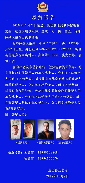 悬赏通告称,2019年7月7日凌晨,襄垣县北底乡杨家嘴村发生一起重大刑事案件,造成一死一伤。经查,犯罪嫌疑人秦英已畏罪潜逃。犯罪嫌疑人秦英,绰号“二胖”,男,1972年1月22日出生,身份证号140423197201222814,襄垣县北底乡杨家嘴村人,身高约1.68米,头发微卷,襄垣口音。