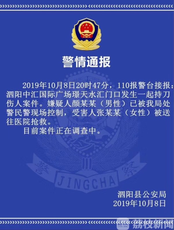 2019年10月8日晚8点47分,泗阳警方接到报警称,县城某小区门口发生持刀伤人案件。
