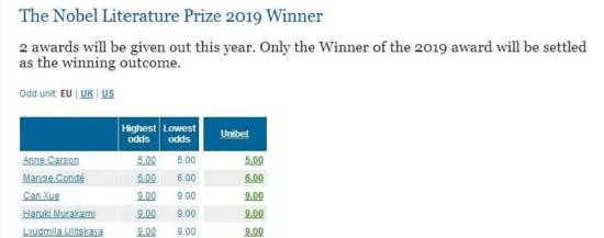 英国博彩公司Nicerodd发布赔率榜,中国作家残雪一度位列第三。(图片来源:Nicerodd网站截图)