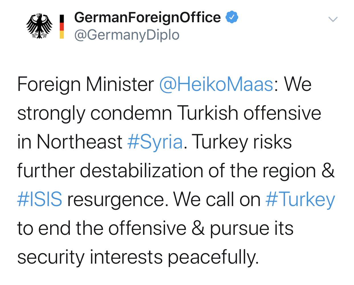 △德外长强烈谴责土耳其进攻叙利亚东北部地区