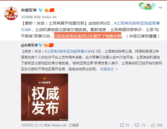 当地时间9日,土耳其对叙利亚发起军事行动,土战机袭击叙北部库尔德武装。最新消息,土耳其国防部表示:土军“和平喷泉”军事行动,已经在幼发拉底河以东展开了地面攻势。