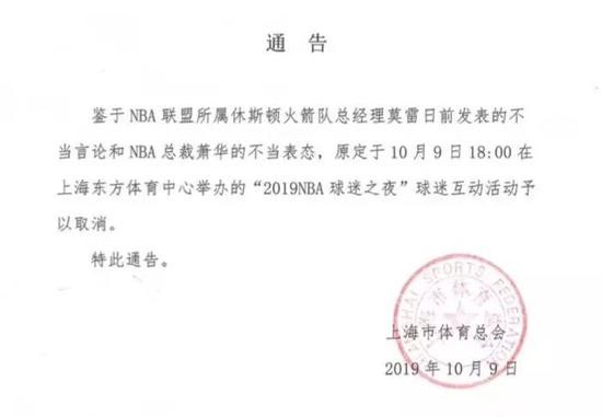 由于一支球队总经理的不当言论,整个NBA被拖下水。最新消息显示,NBA总裁连夜来华也无回天之力,上海体育总会已经发布了取消“2019NBA球迷之夜”活动的通知。