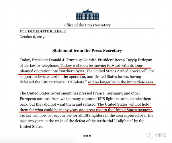 今天,特朗普总统与土耳其总统埃尔多安通了电话。土耳其将很快推进准备已久的行动,出兵叙利亚北部。美国军队既不支持也不卷入这一行动,美国军队在挫败“伊斯兰国”后,也将不继续留在这一地区。