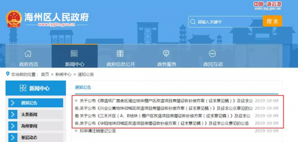 10月9日,海州区人民政府网站上公布了四处地块旧城(棚户区)改造房屋征收补偿方案(征求意见稿)。