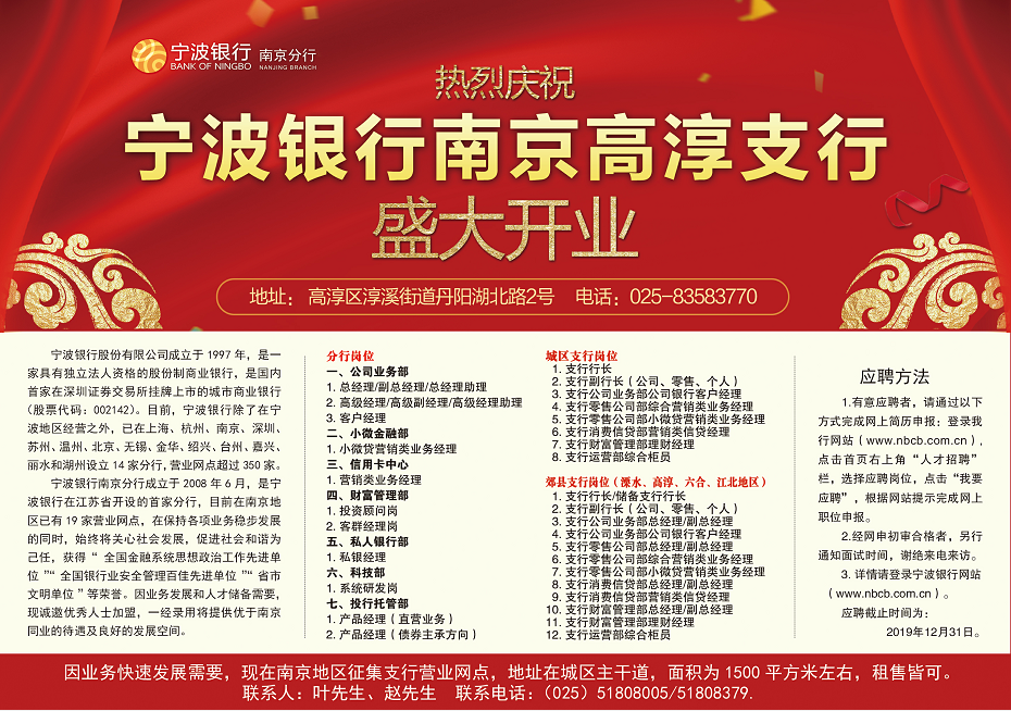 宁波银行南京高淳支行位于高淳区淳溪街道丹阳湖北路2号,立足“智能化、轻型化”将网点功能及区域模块有机融合,是宁波银行南京分行顺应金融科技发展趋势的重要体现。高淳支行将始终坚持合规经营,以支持地方实体经济发展为己任,着力打造“专业过硬、执行力强、敬业度高”的金融服务团队,坚定不移践行普惠金融,持续完善专营服务体系,进一步为服务地方实体经济、小微企业、区域客户作出更大作为。