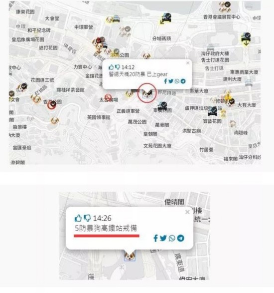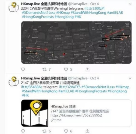 此前,我们《环球时报》在调查中所截取的画面就显示,HKMap.live上会清楚显示“个别”警察的位置,从而很容易令他们成为暴徒的伏击目标。HKMap.live的开发者也会不断在其社交账号上向街头的暴徒通知警方所在的区域,不论警方人数多寡。
