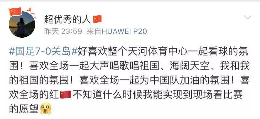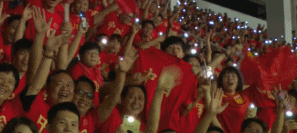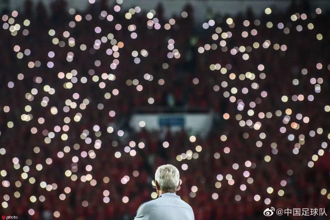 在国足潮水般的进攻下,现场的国足球迷情绪高涨,齐齐高唱《红旗飘飘》,并玩起了“人浪”。第70分钟,现场观众齐齐点亮手机闪光灯,在银光闪闪中高唱国歌以及《我和我的祖国》。赛后国足将士们更是举起国旗,与观众们进行庆祝。