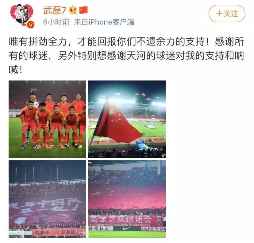 赛后,国足将士们高举五星红旗与球迷一同庆祝