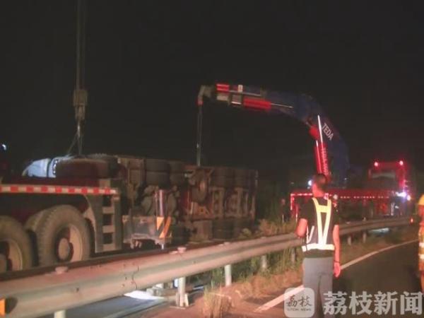 现场,约30吨大小的槽罐车侧翻在地,交警、路政人员已调来两辆吊车对槽罐车实施起吊。