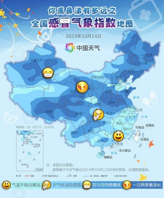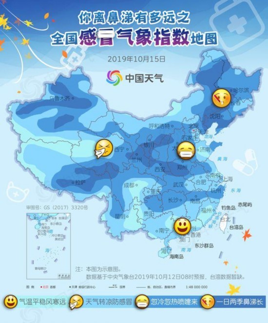 近期,影响我国的冷空气一股紧接一股,在零敲碎打中让气温将降到新低,预计今天(12日)夜间开始到下周初,我国近四分之三地区气温将创今年下半年来的新低,部分地区降温幅度超10℃。气温起伏时,感冒病患往往扎堆出现,中国天气网贴心推出全国感冒气象指数地图,来看看你离鼻涕还有多远?